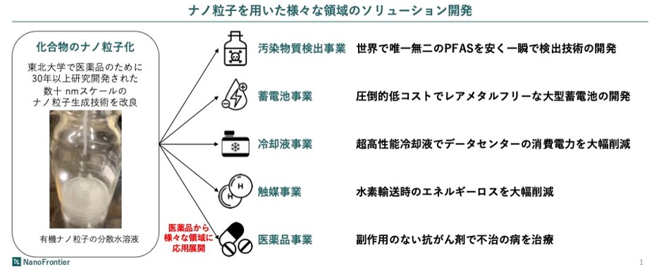 当社は、東北大学発の独自ナノ粒子技術を基盤に、PFASによる環境汚染、大型蓄電池不足に起因するエネルギー課題、データセンターの熱問題など、複雑化する社会課題の解決に取り組んでいます。材料をナノ粒子化することで性能を最大限に引き出し、低コストかつ実装可能な機能性ナノ材料の開発を進めています。さらに、AI・シミュレーション・ロボティクスを活用した研究開発自動化により、従来は試行錯誤を要していた材料開発の実験回数と開発期間を大幅に削減しています。これにより、社会実装までのスピードを高め、国内外へ持続的に価値ある材料技術を展開してまいります。