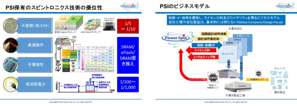 パワースピン株式会社は、東北大学国際集積エレクトロニクス研究開発センター(CIES)の研究成果の社会実装を目的として、2018年10月に設立された東北大学発ベンチャーです。当社は、CIESにて創出・蓄積されたスピントロニクス/CMOS Hybrid 技術等の革新的研究成果を基に、演算性能/消費電力比を従来比100倍以上に高めたハード・システム事業を中心に事業展開していきます。具体的には、STT-MRAM等の省エネメモリやIoT・AI向けの各種アプリケーションプロセッサ等の設計事業、試作事業、知財・IPのライセンシング事業、コンサルテイング事業を進めます。