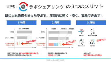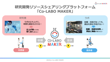 株式会社Co-LABO MAKERは、研究開発の民主化を目指し、研究シェアリングプラットフォーム「Co-LABOMAKER」を立ち上げ、運営している東北大学発 ベンチャーです。